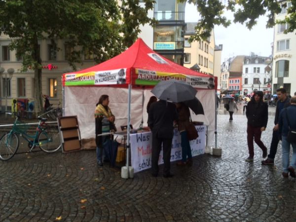 Regenwetter in Deutschland, wie an diesem Kobane-Kurden-Informationsstand in Bonn.