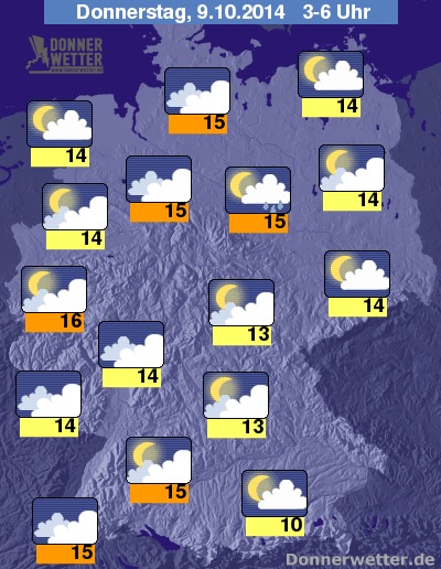 In der Nacht zum Donnerstag bleibt der Himmel aufgelockert bis stark bewölkt, dabei fällt gebietsweise auch Regen, zumeist bleibt es aber trocken. Stellenweise bildet sich Nebel oder Dunst. Im Westen und an der Nordsee weht weiterhin ein zeitweise frischer bis starker Wind. Die Temperatur sinkt bis zum Morgen auf 16 Grad in der Kölner Bucht und bis 10 Grad in Oberbayern.