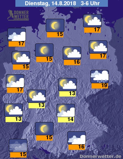 In der Nacht zum Dienstag sind über den östlichen Landesteilen zunächst noch Schauer möglich, die im Laufe der Nacht abklingen, sonst ist der Himmel hingegen meist locker bewölkt oder sternenklar, an der Nordsee auch oft stark bewölkt, aber trocken. Die Temperatur sinkt auf 19 Grad in Dresden und bis 13 Grad im Eichsfeld.
