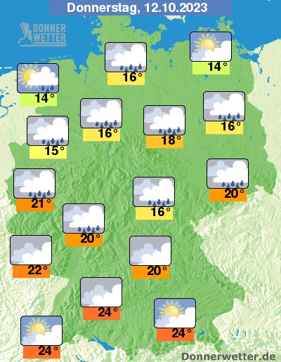 Am Donnerstag ist es über dem Bundesgebiet stark oder dicht bewölkt und Auflockerungen sind eher selten. Im Süden bleibt es weitgehend trocken, sonst fällt allerdings gebietsweise Regen. Die Temperatur steigt auf 14 Grad an der See und bis 24 Grad in Schwaben.