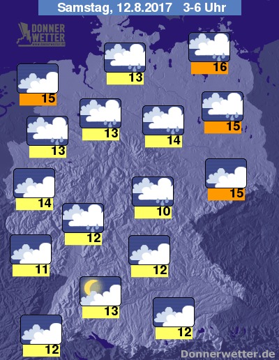 In der Nacht zum Samstag ziehen größtenteils dichte Wolken übers Land hinweg, dabei fällt im Süden gebietsweise, sonst zeitweise Regen. Die Temperatur sinkt auf 16 Grad in Stralsund und etwa 10 Grad im Thüringer Becken.