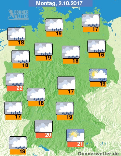 Heute halten sich über Deutschland verbreitet dunkle und dichte Wolken, Auflockerungen sind hier und da allerdings möglich. Es fällt immer wieder, teils auch kräftiger oder langanhaltender Regen. Die Temperatur steigt auf 16 Grad im südlichen Brandenburg und bis 22 Grad in der Kölner Bucht.