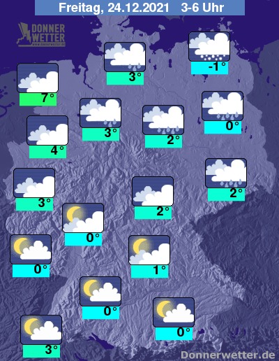 An Heiligabend bleibt es über Deutschland verbreitet bedeckt oder neblig-trüb, nur hier da kann es auch mal auflockern. Es fällt gebietsweise Regen bei Werten von 2 Grad in Vorpommern und bis 10 Grad am Oberrhein.