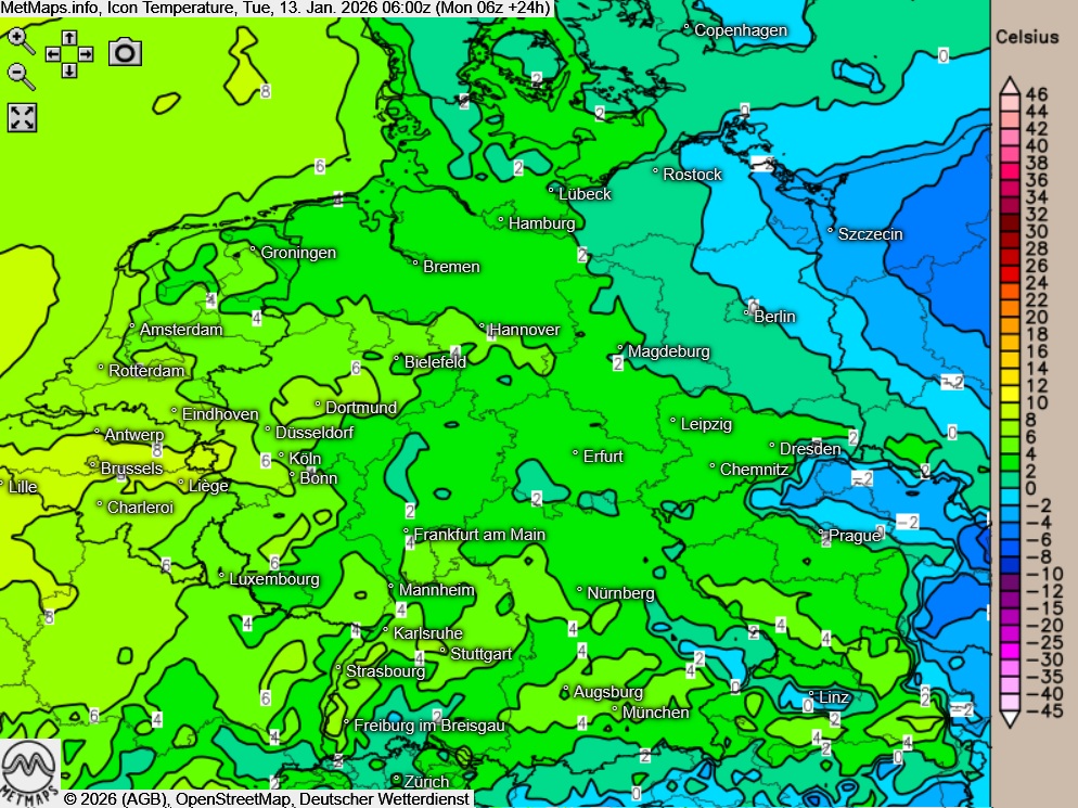 Die Temperaturen erreichen Höchstwerte um 0 Grad im Nordosten und 13 Grad am Oberrhein.
