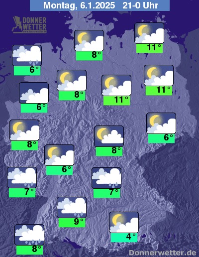 In der Nacht zum Dienstag ist es meist wechselnd oder stark bewölkt, dabei fällt im Westen und Nordwesten zeitweise Regen, im Bergland auch Schnee. Niederschläge gibt es zudem vom Alpenrand bis nach Ostbayern.