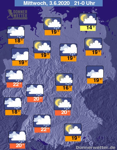 Bis Mitternacht dominieren oft die Wolken und es muss gebietsweise mit weiteren Regengüssen gerechnet werden, vereinzelt blitzt und donnert es dabei noch. Im Osten bleibt es überwiegend trocken.