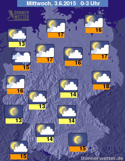 Örtliche Schauer beschränken sich auf den Nordwesten Deutschlands, hier werden mit Tiefsttemperturen um 13 Grad C auch die niedrigsten Werte im Bundesgebiet erreicht. Im Nachtverlauf verlagert sich der Regen dann in Richtung Nordosten