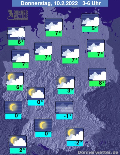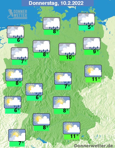Am Donnerstag ziehen von Nordwesten her dichte Wolken durch, dabei fällt zeitweise Regen oder Schneeregen. Besonders im Süden, zum Teil aber auch im Küstenumfeld zeigen sich lokale Auflockerungen, im Süden bleibt es dabei trocken. Die Temperatur steigt auf 6 Grad im Saargau und bis 11 Grad in der Lausitz.