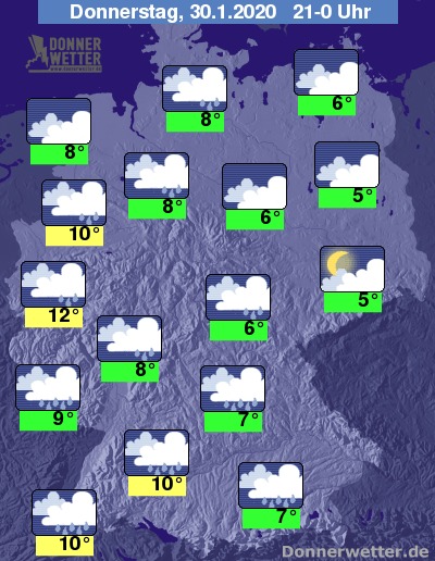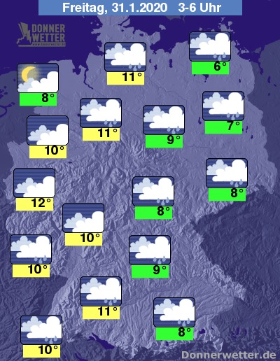 Die Frühwerte liegen in der Osthälfte noch zwischen 6 und 9 Grad, sonst werden häufig Werte im zweistelligen Bereich gemessen - für eine Winternacht ungewöhnlich mild.