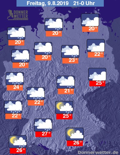 Am Abend treten in der Westhälfte häufige Regenfälle oder Schauer auf, im Südwesten drohen teils kräftige Gewitter mit Gefahr von Unwettern. Auch im Osten gewinnen die Wolken langsam die Oberhand, hier sollte es aber zunächst noch trocken bleiben. Am längsten kann man die allmählich untergehende Sonne noch in Sachsen und Bayern genießen.
