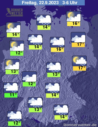 In der bevorstehenden Nacht erreicht die Regenfront auch die östlichen Landesteilen, sonst ist es auch oft stark, hier und da aufgelockert bewölkt. In den westlichen Landesteilen bleibt es schon meist trocken, sonst fällt aber weiterhin gebietsweise Regen. Die Temperatur sinkt auf 17 Grad in Dresden und 11 Grad in Saarbrücken.
