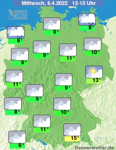 Heute Nachmittag ziehen fast ausnahmslos dichte Wolken über die Bundesrepublik hinweg, dabei bilden sich nur vereinzelte Schauer oder es fällt etwas Regen. Die Temperatur liegt bei 8 Grad in Rostock und bis 15 Grad in München. Es weht ein oft stürmischer Wind.