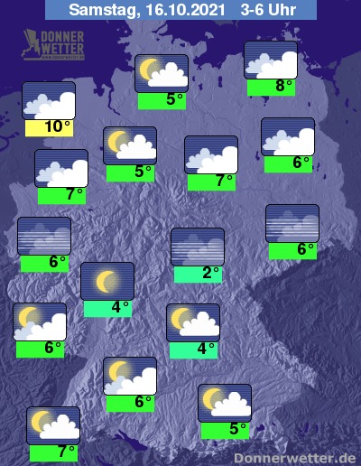 In der Nacht zum Samstag zeigt sich der Himmel von der breiten Mitte des Landes bis in den Süden meist gering bewölkt oder sternenklar, hier und da sind auch mehr Wolken möglich. Im Norden ist es hingegen oft stark bewölkt, hier und da zeigen sich Auflockerungen. Es bleibt landesweit trocken bei Tiefstwerten von 10 Grad in Bremerhaven und bis 2 Grad in Jena.