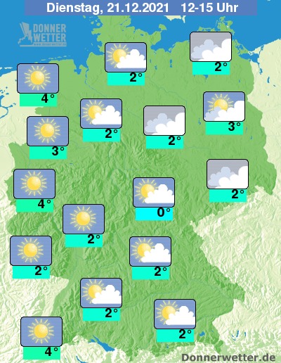 Heute Nachmittag ist es über der Westhälfte der Republik verbreitet heiter bis sonnig. Im übrigen Land ist es oft trüb, Aufheiterungen sind dennoch möglich. Es bleibt praktisch überall trocken, ganz vereinzelt können im Osten und Nordosten wenige Flocken oder Tropfen fallen. Die Temperatur liegt bei 0 Grad im Thüringer Becken und bis 4 Grad im Rheinland.
