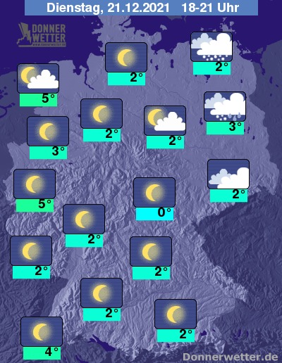 Heute Abend zeigt sich der Himmel über dem Land größtenteils sternenklar. Im Osten und Nordosten hält sich hingegen auch oft dichte Bewölkung, Auflockerungen bleiben dazu eher selten, hier und da sind einige Flocken oder Tropfen möglich, im übrigen Land bleibt es aber trocken. Die Temperatur liegt bei 0 Grad in Erfurt und bis 5 Grad in Köln.