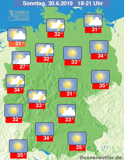 Heute Abend ist es noch größtenteils sonnig über der Bundesrepublik, vor allem im Norden und Westen sind aber hier und da einige, teils dichte Quellwolken möglich, dazu besteht ein leichtes Schauer- und Gewitterrisiko, sonst bleibt es jedoch weitgehend trocken. Die Temperatur erreicht anfangs Werte von 21 Grad in Emden und bis 35 Grad in Dresden.