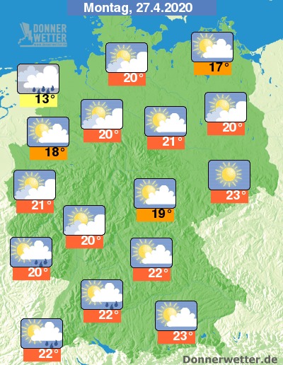 Heute ist es oft heiter bis sonnig, besonders am Nachmittag ziehen jedoch gebietsweise auch einige, teils dichte Wolken auf, dabei sind im Süden und Südwesten sowohl Schauer als auch Gewitter möglich. Im Umfeld der Nordsee sind einzelne Schauer möglich, im übrigen Land bleibt es hingegen weitgehend trocken. Die Temperatur steigt auf 13 Grad direkt an der Nordsee und bis 23 Grad in der Lausitz.