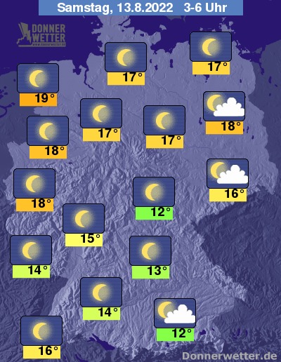 In der Nacht zum Samstag funkeln die Sterne von einem weitgehend wolkenlosen Himmel. In den östlichen Landesteilen sind hier und da lockere Wolkenfelder möglich. Es bleibt trocken bei Tiefstwerten von 19 Grad an der Nordsee und 12 Grad im Berchtesgadener Land.