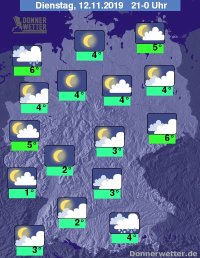 Bis Mitternacht fällt im südöstlichen Bayern teilweise bis in tiefere Lagen herab Schnee oder Schneeregen, wobei es zu Glätte auf Straßen und Gehwegen kommen kann. Im übrigen Land zeigen sich gebietsweise für längere Zeit die Sterne, sonst bleibt es wechselnd bewölkt und speziell an der Grenze zu Benelux können einzelne Schauer auftreten.