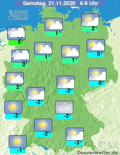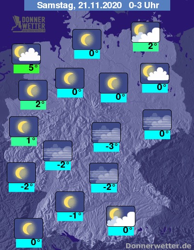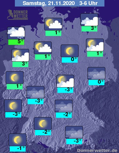Bis zu den Frühstunden kühlt die Luft meist auf 1 bis -3 Grad ab und es muss mit Reifglätte gerechnet werden. Lediglich im Nordwesten sowie an den Küsten von Nord- und Ostsee bleibt es mit 6 bis 3 Grad meistens frostfrei.