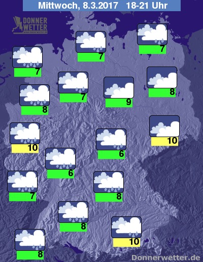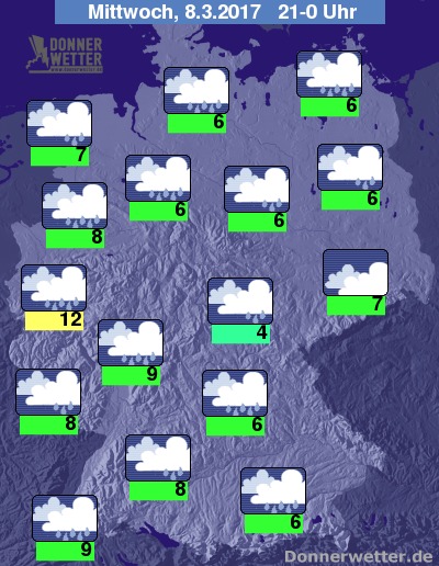 Am späten Mittwochabend regnet es in weiten Teilen des Landes - vor allem im Süden und Westen sind auch länger anhaltende und ergiebigere Niederschläge möglich. Unter einer meist geschlossenen Wolkendecke und dem Einströmen wärmerer Luft erreichen die Temperaturen bis zum späten Abend Werte um 4 bis 12 Grad C, in der Nacht dann Tiefstwerte um 8 bis 4 Grad C.