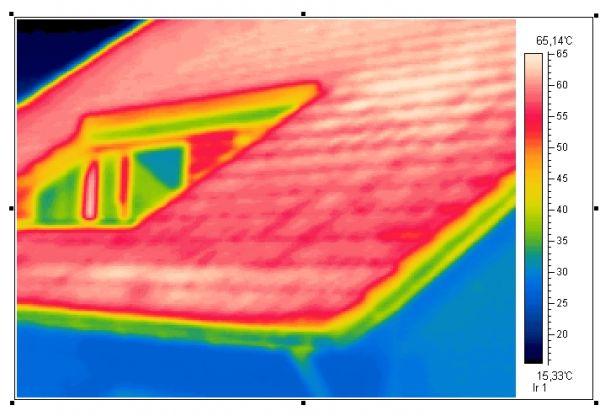 Das Foto zeigt die gemessenen Temperaturen eines Hausdachs bei starker Sonneneinstrahlung im Hochsommer. Die registrierte Maximaltemperatur liegt hier bei rund 65 Grad C. Bei den derzeitigen Außenverhältnissen würden sich wohl nur noch die wenigsten aufs Hausdach wagen.