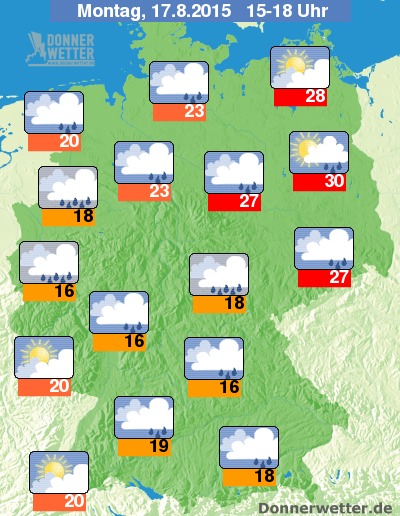 Heute Nachmittag wird es an der Nordseeküste und in Westen überwiegend bewölkt. Niederschläge sind zentral über Deutschland sehr wahrscheinlich. An der Ostseeküste wird es weitgehend bedeckt, die Sonne wird sich nur kurz zeigen. Im Saarland und im Schwarzwald ebenfalls viele Wolken und nur wenig Sonne. Die Temperaturen erreichen regnerische 16 Grad C am Taunus und bis zu 30 Grad C in Brandenburg.