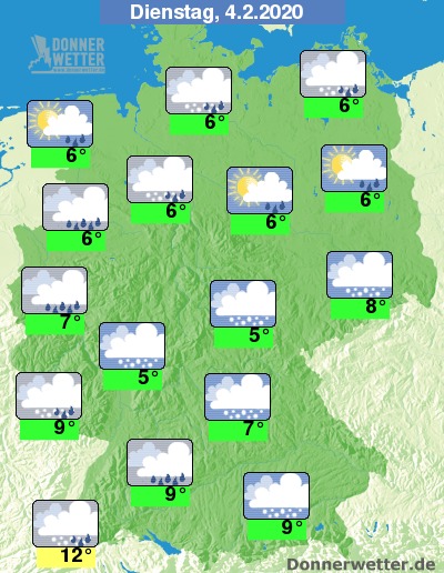 Abgesehen von kurzen Aufheiterungsabschnitten mit etwas Sonne dominieren kompakte Wolken aus denen es immer wieder regnet, in höheren Lagen auch schneit, an den Westhängen der Gebirge auch längere Zeit und intensiver. Ab Mittag gibt es Schauer, örtlich treten auch Graupelgewitter auf. Die Schneefallgrenze sinkt allmählich auf 300 bis 500 Meter.