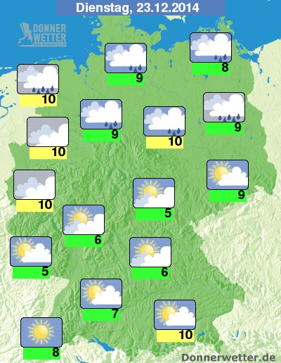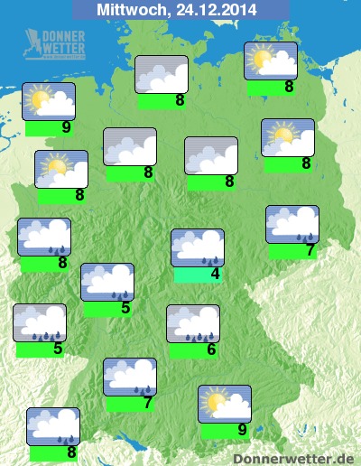 Am Mittwoch ist es vom Norden bis in die breite Mitte des Landes meist stark oder dicht bewölkt und es fällt zeitweise Regen, im Süden ist es auch teils aufgelockert bewölkt und überwiegend trocken. Es werden 4 bis 9 Grad erreicht.