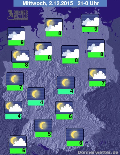In der Nacht zum Donnerstag bleibt es vor allem in den küstennahen Regionen und im äußeren Osten des Landes meist stark bewölkt, jedoch trocken. Im übrigen Deutschland zeigt sich der Himmel dagegen überwiegend sternenklar und sonst locker bewölkt, dabei bleibt es natürlich trocken. Die Temperatur sinkt auf 8 Grad in Rostock und bis 2 Grad am Pfälzer Wald. Gebietsweise bildet sich Nebel oder Hochnebel, dabei ist vor allem im Süden und Südwesten stellenweise Glätte durch überfrierende Nässe möglich!