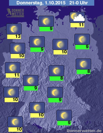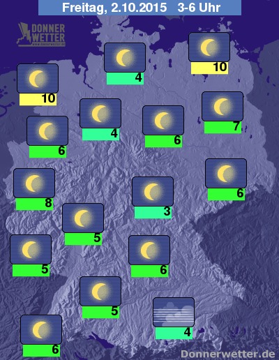 In der Nacht zum Freitag ist der Himmel über dem Land weitgehend sternenklar und es bleibt trocken. Die Temperatur sinkt auf Werte um 10 Grad an den Küsten von Nord- und Ostsee und auf etwa 4 Grad im Raum München. Im Süden Deutschlands bildet sich gebietsweise Nebel oder Hochnebel, dazu besteht auch stellenweise die Gefahr durch Reifglätte.
