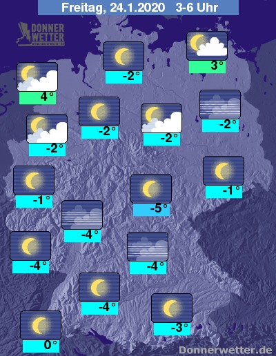 Bis zu den Frühstunden kühlt die Luft auf frostige -6 bis 0 Grad ab und es kann zu Reifglätte kommen. Positive Werte gibt es nur an den Küsten von Nord- und Ostsee.