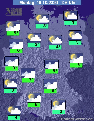 In der folgenden Nacht zeigt sich der Himmel über dem Nordosten, teils auch über dem Norden und Osten locker bewölkt bis sternenklar. Oft locker bewölkt bis sternenklar ist es auch im Alpenvorland. Im übrigen Bundesgebiet ist es hingegen eher trüb oder stark, teils auch mal aufgelockert bewölkt. Es bleibt trocken bei Tiefstwerten von 9 Grad im nördlichen Emsland und bis 3 Grad in Oberbayern.