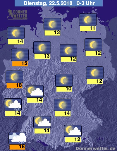 Die Temperaturen sinken auf Werte um 18 Grad C im Rheinland und um 10 Grad C im Thüringer Wald.