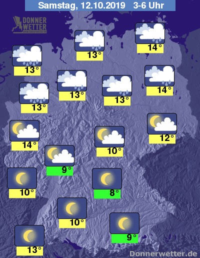 Bis zu den Frühstunden kühlt die Luft unter dem klarem Sternenhimmel Süddeutschlands auf 7 bis 11 Grad ab, am mildesten bleibt es im Breisgau mit 13 Grad. Milde Werte zwischen 11 und 14 Grad gibt es auch unter den dichteren Wolken im Norden, sowie in den Ballungsgebieten des Westens.