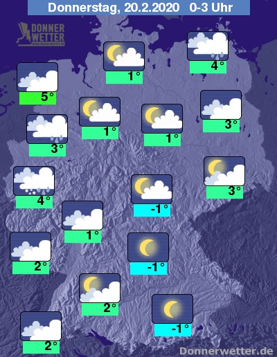 In der Nacht auf Donnerstag bleibt der Himmel über weiten Teilen der Westhälfte Deutschlands bedeckt, dabei breiten sich in den kommenden Stunden Schauer aus. In der Osthälfte des Landes ist der Himmel teils locker bewölkt, teils sternenklar und es ist meist trocken.