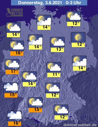 In der Nacht auf Donnerstag nimmt die Bewölkung über der West- und Südwesthälfte zu, dabei muss immer wieder mit einzelnen Schauern gerechnet werden, lokal sind auch Gewitter möglich. In den übrigen Landesteilen bleibt es geringbewölkt und meist trocken.