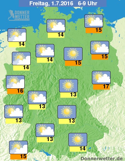 Der erste Julitag startet dann mit einem zumeist trockenen Mix aus Sonne und Wolken, strahlenden Sonnenschein gibt es zunächst vor allem entlang der Mittelgebirge.