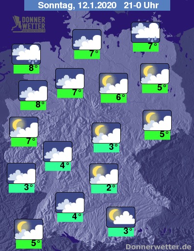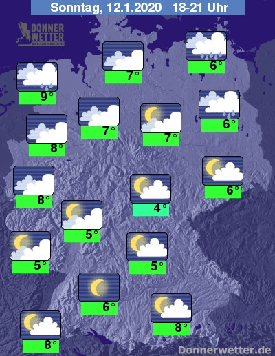 In den Abendstunden bleibt der Himmel im Norden und Westen überwiegend stark bewölkt oder bedeckt, vor allem im Umfeld der Küsten ist weiterhin mit Schauern zu rechnen. Im Süden ist es anfangs noch locker bewölkt, im Abendverlauf nimmt dann die Bewölkung aber auch hier zu, so dass es meist bedeckt oder aufgelockert bewölkt ist.