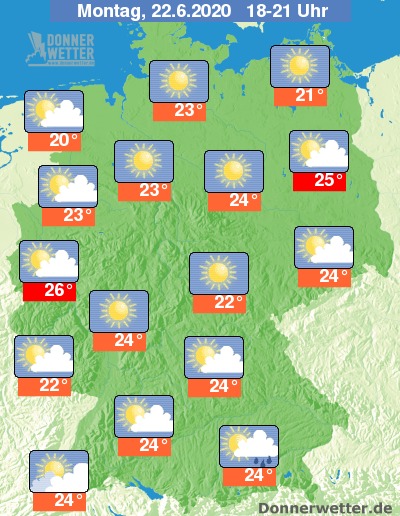 In den Abenstunden überwiegt am Himmel ein Mix aus heiteren Phasen oder nur lockerer Bewölkung. Im Norden und der Mitte scheint die Sonne zeitweise auch von einem wolkenlosen Himmel. Bis auf einzelne mögliche Schauer im Alpenvorland bleibt es am Abend trocken.