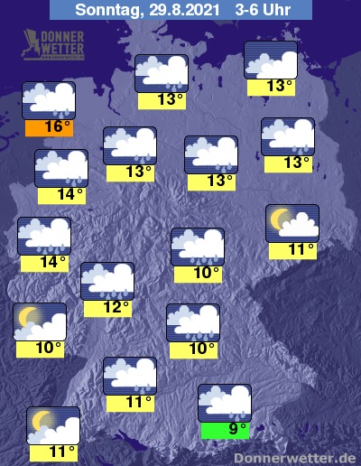 In der folgenden Nacht bleibt der Himmel bedeckt oder stark bewölkt, lediglich im Südwesten und über Sachsen ist der Himmel auch verbreitet nur locker bis wechselnd bewölkt, hier bleibt es meist trocken. Im übrigen Bundesgebiet bilden sich immer wieder Schauer. Die Temperatur sinkt auf 16 Grad in Cuxhaven und bis 9 Grad in Berchtesgaden.