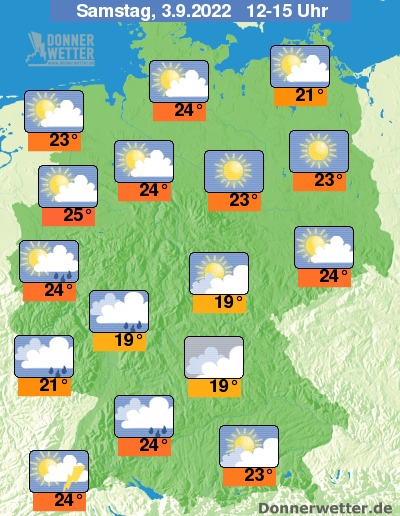 In den Nachmittagsstunden zeigt sich der Himmel über dem Süden und Südwesten wechselnd bis stark bewölkt und örtlich muss mit teils kräftigen Schauern und Gewittern gerechnet werden. Über der Nord- und Osthälfte Deutschlands ist es heiter oder nur gering bewölkt und es bleibt trocken.