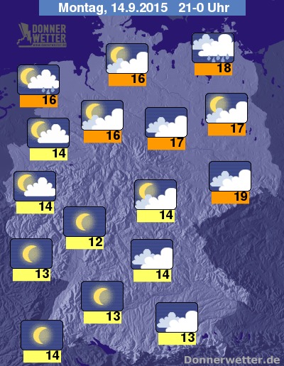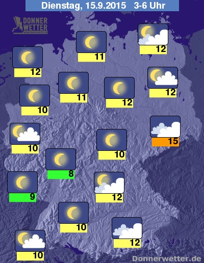 In der Nacht zum Dienstag halten sich vor allem im Osten und Südosten oft dichte Wolken, aus denen aber nur selten etwas Regen fällt. Im übrigen Bundesgebiet zeigt sich der Himmel hingegen meist sternenklar, gebietsweise ist es aber auch locker bewölkt. Gegen Morgen ziehen im Westen und Nordwesten teils dichte Wolken auf, die vereinzelt Regen bringen können, sonst bleibt es aber trocken. Die Temperatur sinkt auf 15 Grad in Riesa und bis 8 Grad am Odenwald.