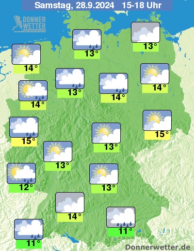 Am Samstagnachmittag zeigt sich der Himmel teils stark, teils aufgelockert bewölkt. Dabei muss vor allem in der Nord- und Westhälfte mit einzelnen Schauern gerechnet werden, am Alpenrand Regen.