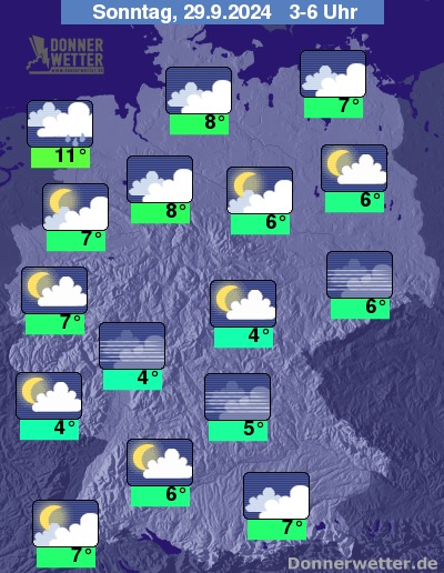 In der Nacht zum Sonntag bleibt der Himmel über den Alpen und an der Nordseeküste noch stark bewölkt und es sind einzelne Schauer möglich. Dazwischen klart es verbreitet auf oder es ist nur gering bewölkt, dabei bleibt es meist niederschlagsfrei. Gebietsweise kann sich Nebel bilden.