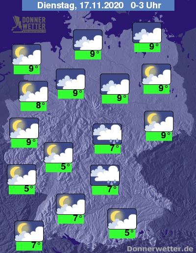 In der Nacht auf Dienstag bleibt die Wolkendecke an Weser und Elbe sowie im Südosten Detuschlands zunächst noch geschlossen, bevor in den frühen Morgenstunden wie in den übrigen Landesteilen ein Mix aus lockerer oder aufgelockerter Bewölkung überwiegt.  Im Südosten kann es dabei zunächst noch vereinzelt tröpfeln, sonst bleibt es häufig trocken.