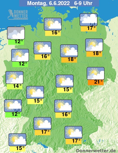 Die Temperaturen erreichen zunächst Werte um 12 Grad im Nordwesten, 15 Grad am Oberrhein und 21 Grad im nördlichen Sachsen.