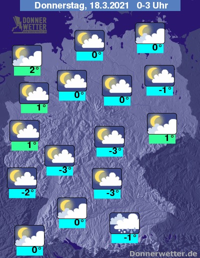 Die Werte sinken um -3 Grad in Mittelfranken, am mildesten bleibt es mit Temperaturen um 3 Grad am Niederrhein.