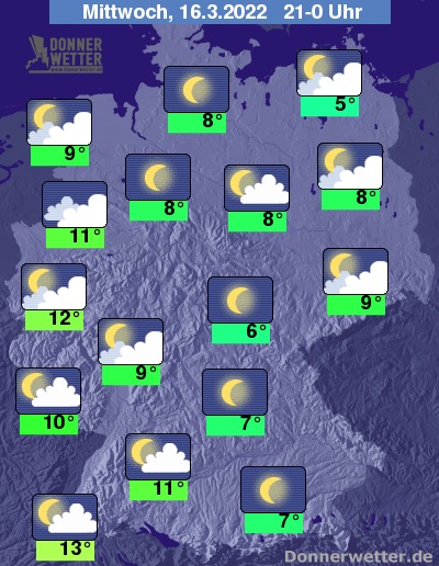 In den Abendstunden zeigt sich der Himmel über weiten Landesteilen locker, am späteren Abend im äußersten Westen und Osten auch wechselnd bis aufgelockert bewölkt. Entlang der Weser und im Südosten klart es im Abendverlauf auf häufig auf. Es bleibt trocken.
