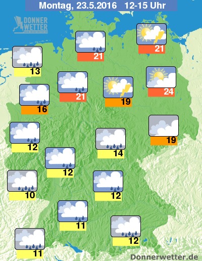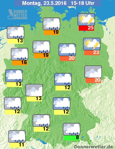Am Montagmittag sowie am frühen Nachmittag sind im Süden und Westen bei dichter Bewölkung oder bedecktem Himmel immer wieder Schauer zu erwarten, die Temperaturen erreichen dabei nur noch Höchstwerte um 10 bis 16 Grad C. Im Osten lässt sich die Sonne dagegen noch häufiger blicken, hier steigt im Tagesverlauf bei Höchstwerten um 25 Grad C allerdings das Gewitterrisiko.